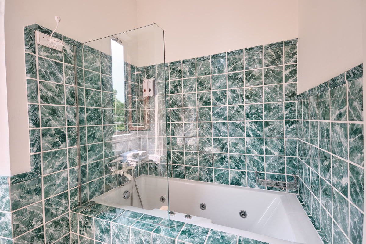 Una estancia premium de 30m2 con vistas a la casita del Porche y al bosque de acacias. Bañera de hidromasaje y galeria con zona de descanso.